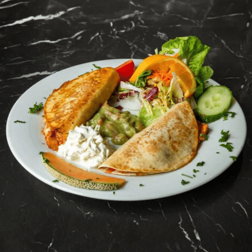 Es werden jeweils 2 Stück serviert.Alle Gerichte werden mit gegrillten Weizenmehl-Tortillas und Käse zubereitet und mit Guacamole und Sauerrahm serviert.