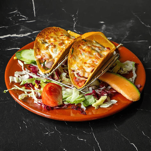Es werden jeweils 2 Stück serviert.Alle Tacos werden in knusprigen Maistortilla-Schalen mit Guacamole und Sauerrahm zubereitet und mit Käse überbacken.